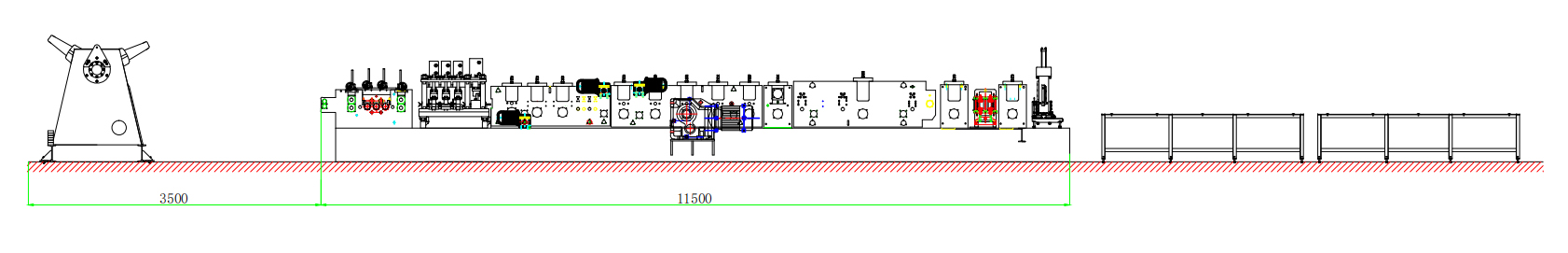 Rulo Açıcı→Besleme ve Düzeltme Cihazı→Hidrolik Ön Kesme ve Delme Cihazı→Haddeleme Şekillendirme Sistemi→Hidrolik Son Kesme→Çıkış Rafı